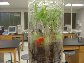 Our ecocolumn is still striving the aquatic system is still clear. The tadpole is fat and happy.? He looked me straight in the eye this morning probably wondering why we put him in this wonderful contraction. The minnow is swimming low to the bottom probably looking for a bit to eat. The duck weed is still a vibrant green floating mystically on the top of the water. The decomposition chamber has a little condensation around the chamber and the piece and the banana is growing mold rapidly. There is micro organisms growing on one of the branches in the terrian chamber.